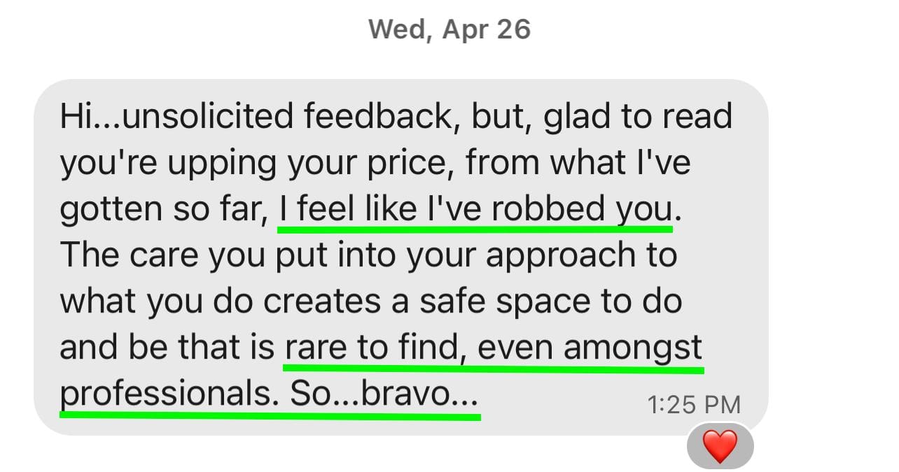 We'll see if the vibe is right first, and if it is I'll give you all the info and answer all of your questions about the program, pricing, and payment options.